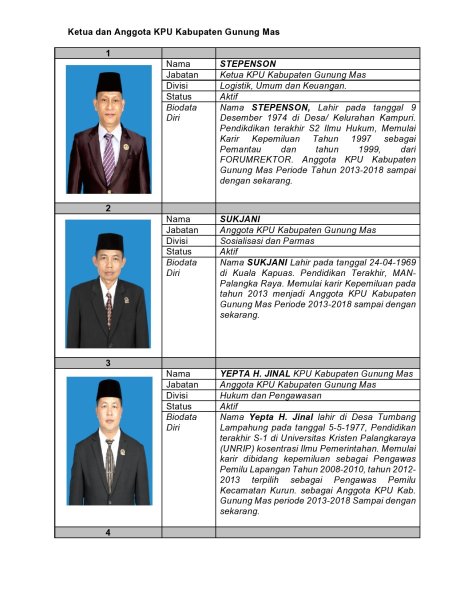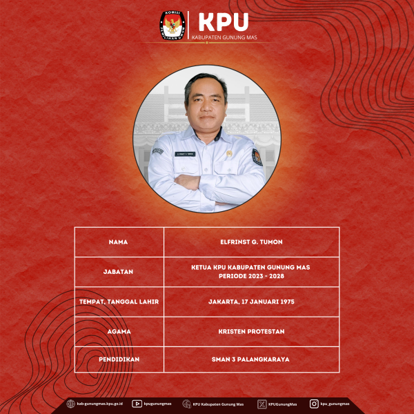 Profil Anggota KPU Kabupaten Gunung Mas Periode 2023-2028 Selasa, 07 Oktober 2025 07:00 26 Profil Ketua, Anggota dan Sekretaris KPU Periode 2023-2028 Baca Selengkapnya