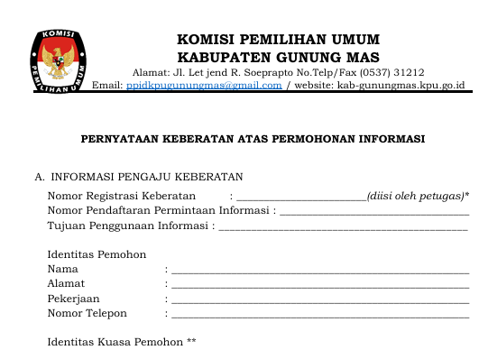 Sengketa Informasi Publik Sengketa yang terjadi antara Badan Publik dengan Pemohon Informasi Publik dan atau Pengguna Informasi Publik yang berkaitan dengan hak memperoleh dan atau menggunakan Informasi Publik berdasarkan peraturan Perundang-undangan (Ketentuan Umum Pasal 1 (3) Peraturan Komisi Informasi Nomor 1 Tahun 2013 tentang Prosedur Penyelesaian Sengketa Informasi Publik) Pemohon Pemohon atau Pengguna Informasi Publik yang mengajukan Permohonan kepada Komisi Informasi ( Pasal 1 (7) Peraturan Komisi Informasi Nomor 1 Tahun 2013 tentang Prosedur Penyelesaian Sengketa Informasi Publik) Termohon Termohon adalah Badan Publik yang diwakili oleh Pimpinan Badan Publik, ATASAN PPID, atau Pejabat yang ditunjuk dan diberi kewenangan untuk mengambil Keputusan dalam PSI di Komisi Informasi (Pasal 1 (8) Peraturan Komisi Informasi Nomor 1 Tahun 2013 tentang Prosedur Penyelesaian Sengketa Informasi Publik) Prosedur Pengajuan Sidang Sengketa Informasi Publik : Pertama pemohon informasi mengajukan permohonan informasi kepada badan publik, kedua badan publik wajib merespon dan memberikan informasi yang diminta oleh pemohon informasi (kecuali informasi yang dikecualikan), ketiga badan publik memiliki waktu selama 10 hari kerja untuk merespon dan memberika informasi yang diminta oleh pemohon informas, keempat jika dalam 10 hari kerja badan publik tidak merespon dan memberikan informasi yang diminta pemohon bisa mengajukan keberatan kepada atasan badan publik. Pasal 2 ayat (1) Undang-Undang Republik Indonesia Nomor 14 Tahun 2008 tentang Keterbukaan Informasi Publik menyatakan bahwa setiap informasi publik bersifat terbuka dan dapat diakses oleh setiap pengguna Informasi Publik. Pasal 4 ayat (4) Undang-Undang Republik Indonesia Nomor 14 Tahun 2008 tentang Keterbukaan Informasi Publik menyatakan bahwa setiap pemohon Informasi Publik berhak mengajukan gugatan ke Pengadilan (Komisi Informasi Pusat atau Daerah) apabila dalam memperoleh Informasi Publik mendapat hambatan atau kegagalan sesuai dengan ketentuan Undang-Undang ini. Pasal 4 Undang-Undang Nomor 14 Tahun 2008 tentang Keterbukaan Informasi Publik menyatakan bahwa : Setiap Orang berhak memperoleh Informasi Publik sesuai dengan ketentuan Undang-Undang ini. Setiap Orang berhak: Melihat dan mengetahui Informasi Publik; Menghadiri pertemuan publik yang terbuka untuk umum untuk memperoleh Informasi Publik. Mendapatkan salinan Informasi Publik melalui permohonan sesuai dengan Undang-Undang ini; dan/atau Menyebarluaskan Informasi Publik sesuai dengan peraturan perundang-undangan. Setiap Pemohon Informasi Publik berhak mengajukan permintaan Informasi Publik disertai Alasan permintaan tersebut. Setiap Pemohon Informasi Publik berhak mengajukan gugatan ke pengadilan apabila dalam memperoleh Informasi Publik mendapat hambatan atau kegagalan sesuai denganketentuan Undang-Undang ini. Jangka Waktu Permohonan Informasi Permohonan informasi berhak mendapatkan pemberitahuan tertulis tentang diterima atau tidaknya permohonan informasi dalam jangka waktu 10 hari kerja sejak diterimanya permohonan informasi oleh Badan Publik. Badan Publik dapat memperpanjang waktu untuk memberi jawaban tertulis 1×7 hari kerja dalam hal informasi yang diminta belum dikuasai/didokumentasikan/belum dapat diputuskan apakah informasi yang diminta termasuk informasi yang dikecualikan atau tidak. Jadi 10 hari kerja ditambah 7 hari kerja. Pengajuan Keberatan Pertama keberatan disampaikan kepada atasan badan publik, kedua atasan badan pubik harus merespon atas keberatan dan memberikan informasi yang diminta selama 30 hari kerja. Ketig jika selama 30 hari kerja tidak ada respon dari atasan badan publik maka pemohon informasi bisa menggugat badan publik ke Komisi Informasi daerah (KID) tingkat Provinsi atau ke Komisi Informasi Pusat (KIP) jika ditigkat provinsi belum terbentuk. Pasal 36 ayat (1) Undang-Undang Republik Indonesia Nomor 14 Tahun 2008 tentang Keterbukaan Informasi Publik menyatakan bahwa keberatan diajukan oleh Pemohon Informasi Publik dalam jangka waktu paling lambat 30 (tiga puluh) hari kerja setelah ditemukannya alasan sebagaimana dimaksud dalam Pasal 35 ayat (1). Pengajuan Sengketa Pertama pemohon informasi mengajukan sengketa ke Komisi informasi setalah 30 hari kerja ketika atasa badan publik tidak merespon, kedua batas waktu pengajuan sengketa informasi 14 hari kerja setelah batas waktu 30 hari kerja setelah atasan badan publik tidak merespon atas keberatan, ketiga 14 hari kerja sejak diterimanya permohonan informasi sengketa informasi, sengketa informasi harus melakuka proses penyelesaian sengketa informasi, keempat jika pengajuan sengketa melewati batas waktu 14 hari kerja maka komisi informasi tidak wajib menerima permohonan sengketa informasi oleh pemohon. Pasal 13 Peraturan Komisi Informasi Nomor 1 Tahun 2013 tentang Prosedur Penyelesaian Sengketa Informasi Publik menyatakan : Permohonan diajukan selambat-lambatnya 14 (empat belas) hari kerja sejak: Tanggapan tertulis atas keberatan dari atasan PPID diterima oleh Pemohon; atau Berakhirnya jangka waktu 30 (tiga puluh) hari kerja untuk atasan PPID dalam memberikan tanggapan tertulis. Penyelesaian Sengketa Pasal 5 Peraturan Komisi Informasi Nomor 1 Tahun 2013 tentang Prosedur Penyelesaian Sengketa Informasi Publik menyatakan bahwa : Pemohontidakpuasterhadaptanggapanataskeberatan yang diberikanolehatasan PPID; atau Pemohontidakmendapatkantanggapanataskeberatan yang telahdiajukankepadaatasan PPID dalamjangkawaktu 30 (tigapuluh) harikerjasejakkeberatanditerimaolehatasan PPID Terhadap perkara ini, Pemohon telah mendapatkan jawaban atas permohonan informasi yang diajukan namun Termohon tidak memberikan jawaban/tanggapan yang lengkap, dari 5 informasi yang diajukan hanya 2 yang dijawab tanpa penjelasan dan untuk 3 informasi tidak ditanggapi. Kewajiban Pemohon Menyampaikan identitas dan tidak menyalahgunakan informasi yang diminta. Kewajiban Badan Publik Menerima permohonan informasi dan pengajuan keberatan atas pelayanan informasi.